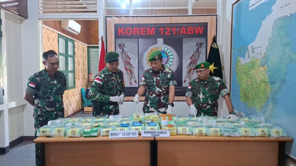 Barang Bukti Narkotika jenis Sabu tersebut di serahkan oleh Satgas Pamtas RI-Malaysia Yonarhanud 1/Pbc Kostrad kepada Danrem 121/Abw Brigjen TNI Purnomosidi, S.I.P., M.A.P., M.Han., selaku Komandan Komando Pelaksana Operasi Satgas Pamtas RI-Malahsia, bertempat di Kediaman Danrem 121/Abw, Pontianak, Kalimantan Barat, Jumat (13/03/2026).